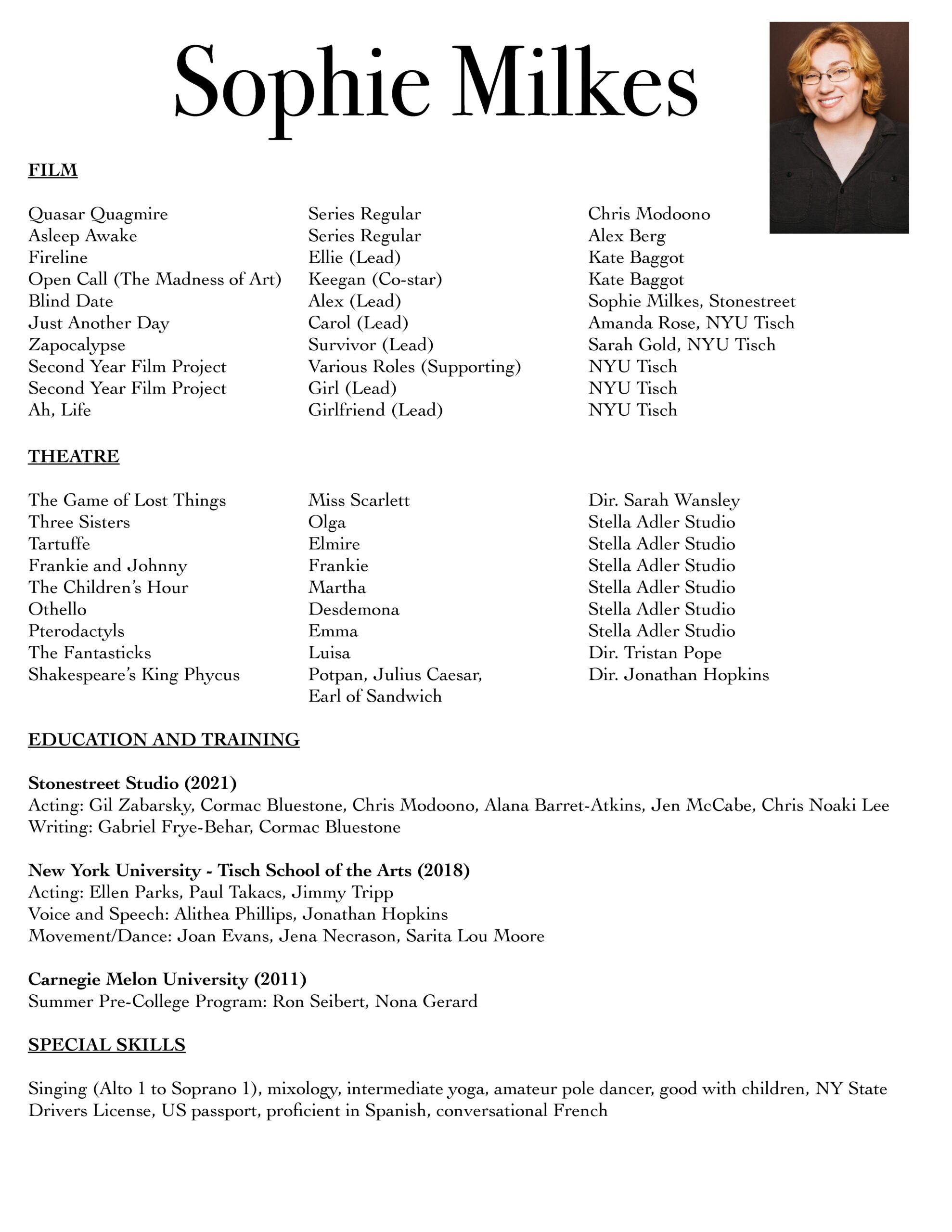 Sophie Milkes is an actor and singer with additional interests in writing and directing. She has a BFA from Tisch School of the Arts at NYU, and went on to study at Stonestreet Studios post-graduation.